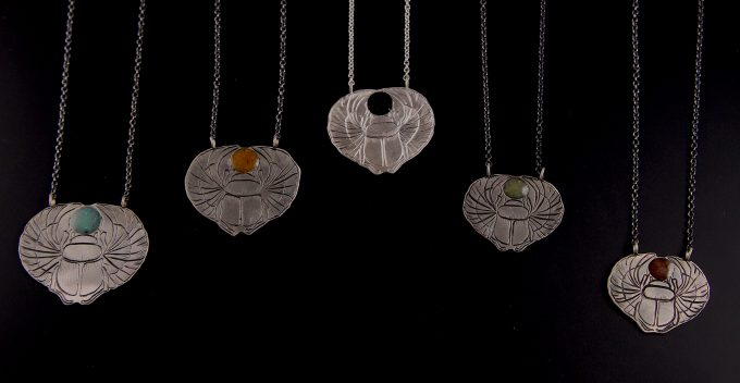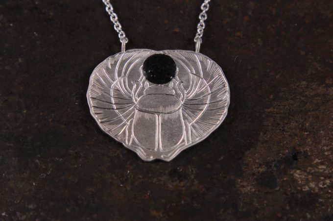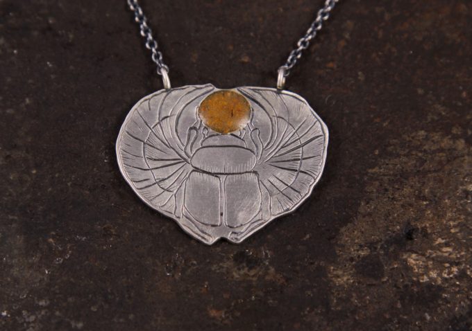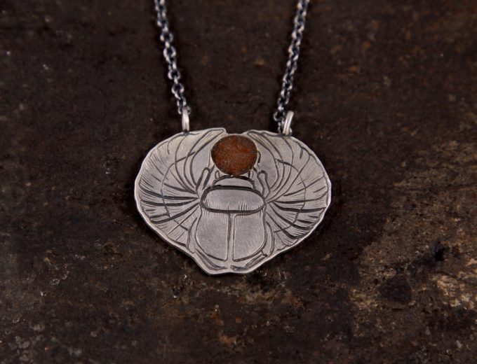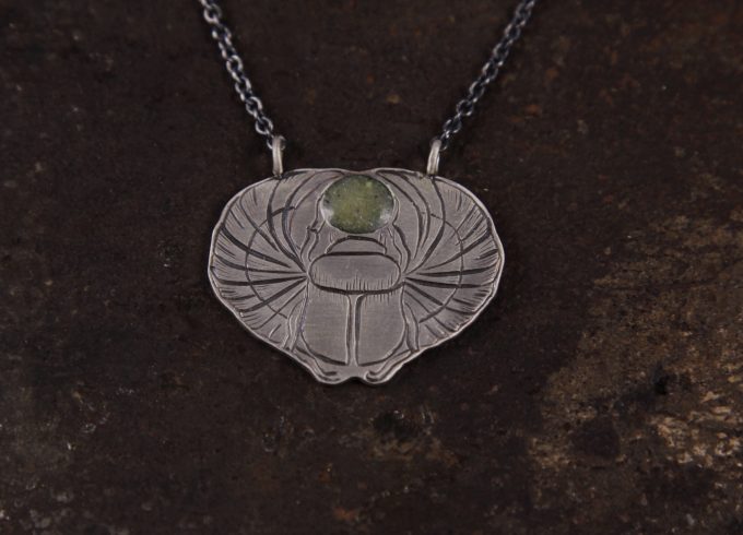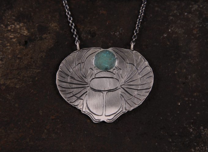 Metall-SchmuckDie Scarab-Kette ist handgraviert und besteht aus RJC-zertifizierten, umweltfreundlichen & recycelten 925 Sterlingsilber und ist mit Feuer und Leidenschaft handgemacht hergestellt. Ausserdem ist ein Türkis- oder Jaspisstein eingelassen.